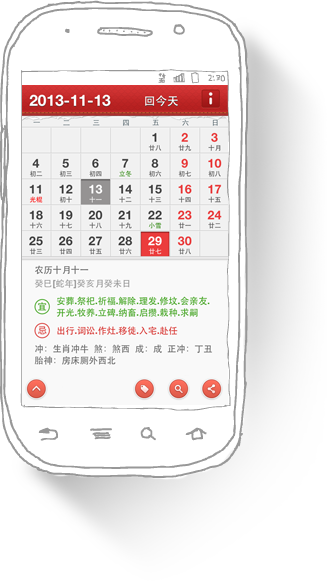 作为一个日历该有的功能我们都有并且很强大:日程管理、传统阴历、黄历宜忌、节假安排、记事安排等等